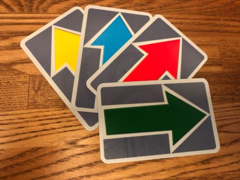 - そしてゲーム再開です。一度盤面のカードを取り除いて新しく矢印と色カードをセットし、矢印カードを手にしたプレーヤーが親となって再開します。