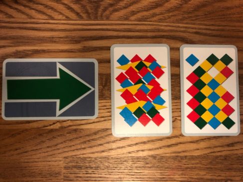 - 矢印カードの山から1枚カードを場に出す。そして、色カードの山からカードを1枚取り、矢印カードの隣に置く。裏面は見ない事。